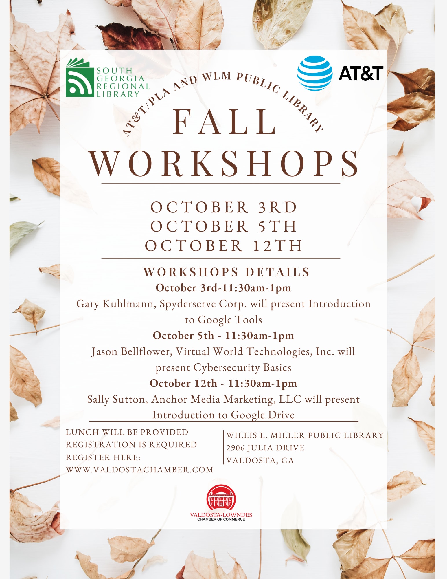 Heavy hors d'oeuvres will be provided- Registration Required Limited to 25 participants - Introduction to Google Drive- Learn the many ways in which Google Drive can be used for uploading, organizing, and sharing files to the cloud in this class. The workshop presenter will be Sally Sutton. Sally is founder and owner of Anchored Media Marketing, LLC. She specializes in helping businesses with their online presence through Search Engine Optimization, Web Design, Social Media Marketing, and other forms of digital media.