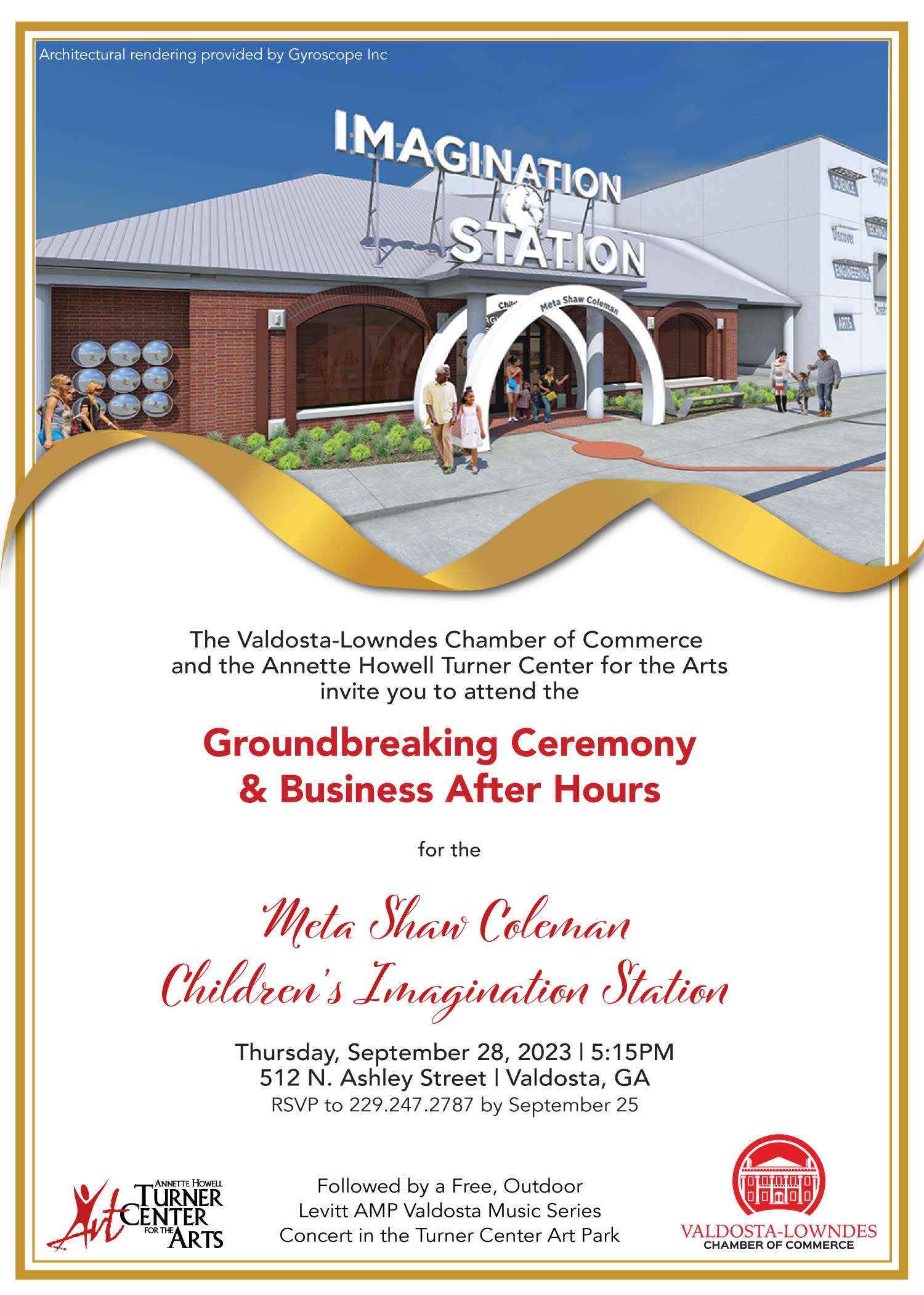 Nothing like it in Valdosta! At this groundbreaking event, the Turner Center for the Arts is ready to showcase the seven-million-dollar Meta Shaw Coleman CHILDREN'S IMAGINATION STATION! Live music, food, drink and lots of engaging conversation and networking as we celebrate the launching of this facility. Invitations are exclusively for all Chamber members, local dignitaries, and donors. Register today to attend and bring a friend!! This event is located just a few doors down from the Chamber at 512 N. Ashley St. Valdosta, GA.