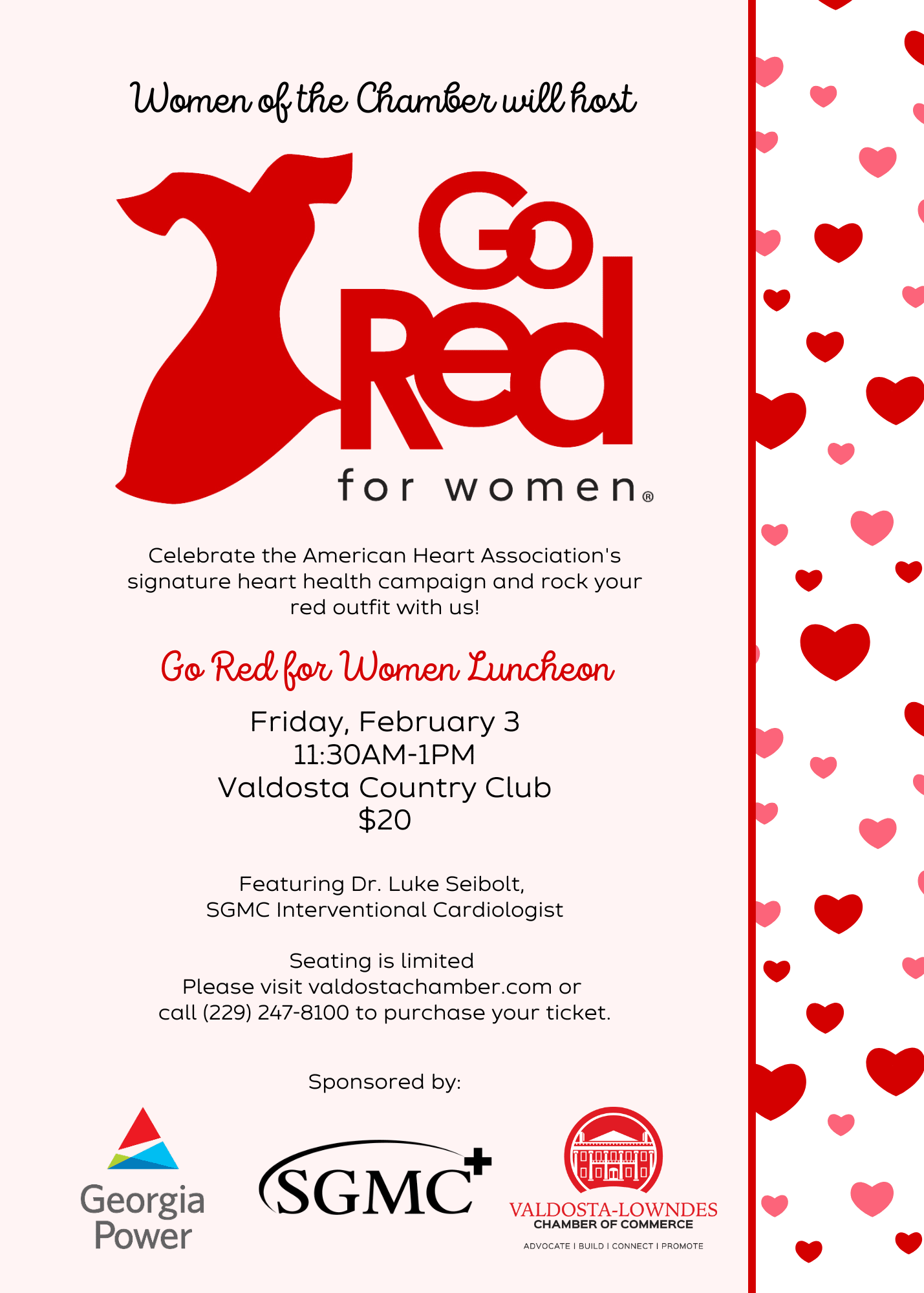 Was improved health among your New Year's resolutions? If so, don't miss the Go Red for Women Luncheon as distinguished cardiologist Dr. Luke Seibolt presents ways to be heart healthy! Let's wear red attire to this event as we recognize February as National Heart Month. This presentation spotlights heart disease as the number one killer of Americans. Learn about the dangers of high blood pressure and preventative measures to combat stroke and heart disease. This important event is sponsored by Georgia Power and hosted by SGMC and the Valdosta-Lowndes Chamber of Commerce. Registration is $20 and lunch will be served.